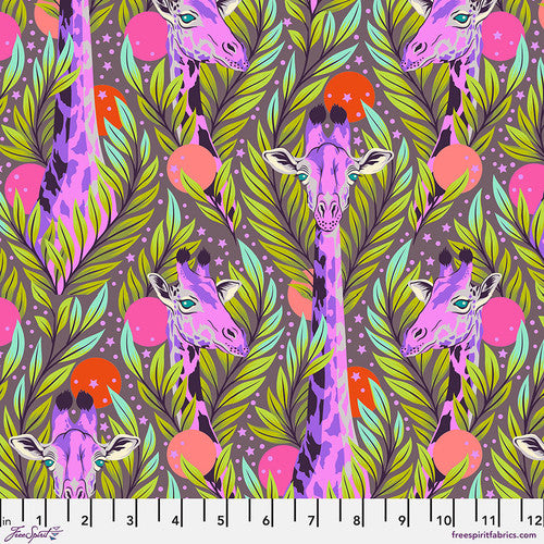Everglow began as a collection of neutrals and evolved into a full collection of radical color designed to add depth to the Tula Pink world of fabrics. When I began designing this collection, I was searching for something new to say about color that would still live in my world. The only realm of color that I have never touched on is the world of neutrals, those subtle colors that create the perfect backdrop to the vibrant color that I am already so fond of. Soft, earthy colors alone wouldn’t stand up to my everyday colors so I decided to pair their whisper with the loudest scream of color I could create on cloth – neons. Each neon is paired with their corresponding neutral in a light, medium and dark. With my neutrals and neons in hand, I just needed a way to illustrate how to use them, so I added 4 large focal prints in two colors each to tie them all together. The animals in Everglow are centered around those that would naturally occur in those palettes. I created golden giraffes in “Neck for Days”, blue grey elephants in “All Ears”, silver hippos in “My Hippos Don’t Lie” and coppery lions in “Good Hair Day”. Each animal is represented in a more accurate color palette and a contrasting color palette that is otherworldly! The result is 8 mini color palette collections that merge together to create an oasis of rainbow goodness in unexpected combinations.
